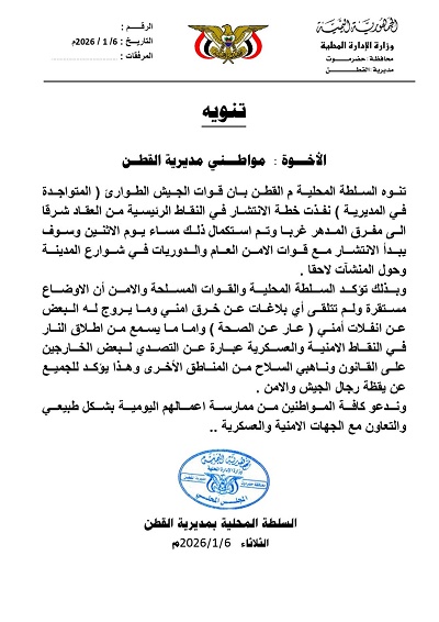 ودعا رئيس نيابة استئناف محافظة حضرموت، وسائل الإعلام ورواد مواقع التواصل الاجتماعي إلى تحري الدقة والمصداقية، وعدم الانسياق وراء الأخبار المضللة التي تهدف إلى إثارة الخوف والبلبلة بين المواطنين.